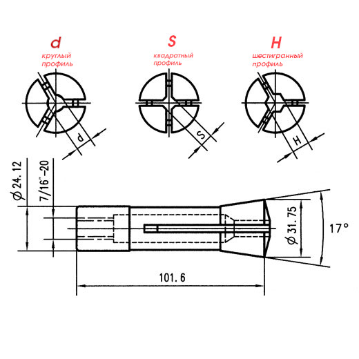 3. Цанги предназначены для применения со всеми станками шпиндель которых имеет стандарт R8 и прочей вспомогательной оснасткой. Цанги различаются по профилю для зажима круглых, четырехгранных шестигранных профилей.